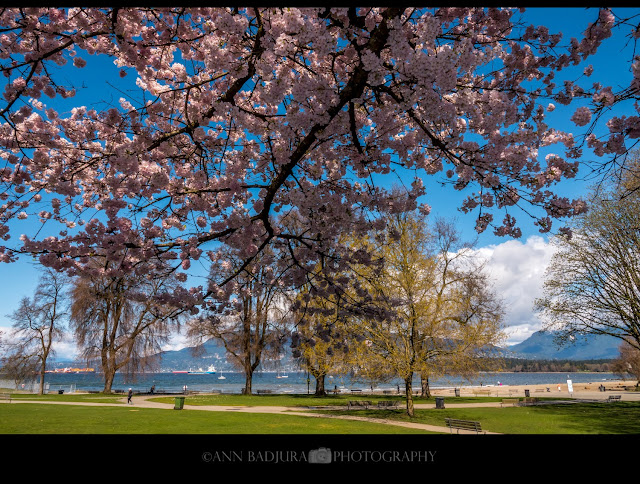 De dag erna ging ik 's morgens wandelen/joggen, want het was droog en dan moet ik er van profiteren. Het zou in de namiddag weer wat gaan regenen. Ik heb dan wat gepoetst en gekookt en voordat ik het wist was het weer tijd om Ava van school te gaan halen. Ik had de dag erna (en dit was ook de laaste dag van maart) zin om weer op bloesem jacht te gaan. Ik ging deze keer naar Queen Elizabeth Park en hoopte dat daar ook al mooie bloesems waren alsook ook andere mooie bloemetjes. Het was een zonnige dag met wat wind, heerlijk! De bloesems bij Queen Elizabeth Park waren prachtig en stonden in volle bloei, er waren al wat mensen aanwezig om foto’s te nemen. Bloesems zijn erg populair hier en er worden dikwijls professionele foto’s genomen. Ik liep van de bloesem bomen net aan de rand van het park richting de tuinen en liep daar door de tuinen heen met al heel wat bloemetjes die aan het bloeien waren en zo ging ik verder naar de plek met het zicht op downtown Vancouver en de bergen, oh zo mooi. Als ik hier klaar was had ik nog genoeg tijd om richting Kitsilano Beach te gaan. Maar tussen Queen Elizabeth Park en Kitsilano Beach is er ook nog een straat in de "Arbutus Ridge" omgeving met bloesems waar ik graag ook even wilde stoppen als de bloesems nog in bloei waren. Ik had de straat gevonden en het was erg mooi, maar de bloesems waren hier al een beetje aan het uitbloeien. Ik heb hier op en neer gelopen en wat foto’s genomen, zo mooi daar!
