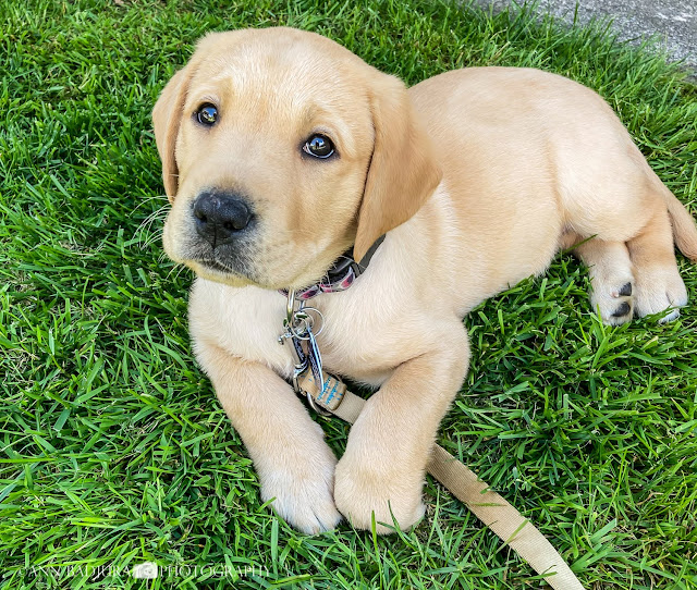 Ik was de dag erna nog even gaan winkelen om wat speeltjes te kopen voor onze puppy. Ik had wat van die plastieken dingen gekocht voor op te kauwen, want dat doen puppies blijkbaar heel veel. Dus hopelijk zijn deze goed, ik had geluk want er was zelfs 50% korting op deze speeltjes! We moesten vrijdag rond de middag bij Judy zijn, dat is de dame die de puppies heeft. Ava had die dag een pedagogische studiedag omdat het een verlengd weekend is en maandag is het dan Victoria Day. Dus de school geeft hun dan nog een extra dagje, dat kwam heel goed uit. Lynn wilde graag met ons mee en zij kwam ons om 11u15 ophalen om naar de puppies te gaan. We kregen "Sadie", nu 7 weken en 2 dagen oud en het is een meisje. Och wat zijn het toch een schatjes, er waren 8 puppies in totaal...6 meisjes en 2 jongens. We kregen een grote zak hondebrokken, twee leibanden, 3 verschillende maten van halsbanden, 2 guide dog vestjes (1 klein en 1 groter), een paar knuffeltjes en andere speetjes, een soort kam, een bot om op de kauwen, kommetjes om uit te eten en ook medicatie voor het ontwormen die we 1 keer per maand moeten geven met 1 van haar maaltijden. We hadden zelf ook een deken meegenomen en een grote knuffel zodat we die over haar mama en broertjes/zusjes konden vegen om zo hun geur erop te krijgen. Hopelijk helpt dat dan als ze ’s nachts gaat slapen en zich alleen voelt. Sadie deed het goed in de auto en lag bij Ava op de schoot als we terug naar huis reden. Lynn zette ons thuis af en wij lieten puppy al even het gras ontdekken aan de leiband. We laten haar even rondom het huis verkennen en even haar vestje aan voor een foto. Daarna gaan we binnen en laten haar voorlopig alleen de helft van de keuken verkennen waar onze keuken tafel staat. Daar zal ook haar bed voor overdag zijn en haar speeltjes.