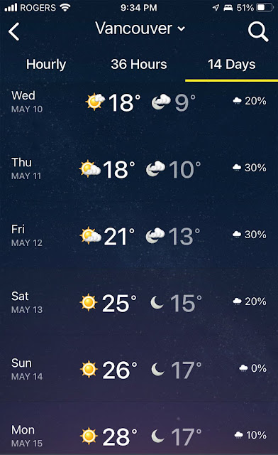 De dag erna was het mijn verjaardag en velen hebben aan mij gedacht. Ik heb vele wensen gekregen viasmsjes, WhatsApp, Facebook en dergelijke, wat fijn! Ava had een kaart voor mij gemaakt, wat lief! Geen cadeautjes, want ik heb niets nodig en ik daar had ik ook niet achter gevraagd. Michael en ik hadden 's middags Chinees uitgehaald bij de food court wat een restauranten hoekje is in de lokale shopping. Ik heb er maar een beetje van gegeten, maar het was wel heel lekker. In de namiddag gingen we met Sadie en Tiny wandelen aan het strand, dat vind ik fijner dan cadeautjes te krijgen. Het was heerlijk om daar langs het water te wandelen in de schaduw van de bomen en het voelde daar helemaal niet zo warm aan. De hondjes hadden het ook naar hun zin en we kwamen hier en daar nog wat andere honden tegen. Ik nam wat foto’s en videotjes onderweg langs het water. We namen ook een paar selfies, want dat is weer lang geleden dat we nog een foto van ons twee hadden. Na een uurtje hier rond te hangen was het wel genoeg geweest en gingen we weer naar huis. Verder hebben we het rustig aan gedaan die dag. Het zou de hele week nog zomerachtig blijven, niet te geloven. Niet zo goed voor het noorden van Alberta en in het noorden van British Columbia waar op dit moment al veel bosbranden woeden, zo vroeg in het jaar. Hopelijk is er voor hun snel regen op komst! En op andere plaatsen is er gevaar voor overstromingen door het warme weer dan dan weer zorgt voor het versnelde smelten van de sneeuw en zo staan de rivieren dus erg hoog. Op donderdag was het Ava haar verjaardag, er was eigenlijk niets dat ze wilde hebben van cadeaus. Ze wou met haar twee beste vriendinnetjes naar een ontsnappingskamer en daarna lekker pizza eten en samen wat rondhangen. We hadden haar een leuke kaart gekocht en ik had haar een petit beurre koek met creme au beurre gemaakt, die wilde ze ook graag.