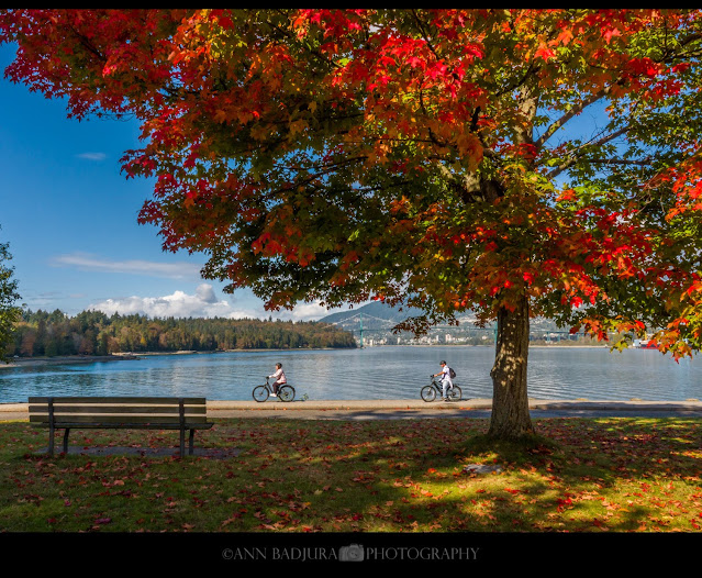 Nadat ik hier even rondgewandeld had met Sadie en Tiny, ging ik verder naar Third Beach, want daar is het ook fijn om een stukje met de hondjes te wandelen. Na onze wandeling bij Third Beach gingen we verder naar de kant waar de mooie zichten zijn op de stad en mogelijk ook wat herfstkleurtjes. Ik parkeerde bij de "Horse Drawn Tours" en zag daar al een paar mooie boompjes die gekleurd waren. Ik liep een stukje langs de seawall met de hondjes en ging daarna verder waar de totem palen staan, daar kan je beide kanten van het park gemakkelijk bekijken...zowel de kant naar downtown Vancouver toe als de kant naar North Vancouver en de Lions Gate Bridge. Sadie poseerde een paar keer heel mooi voor mij, ik had Tiny er ook bij gewild...maar zij houdt niet zo van poseren en heeft er geen geduld voor, haha! Daar heb ik ook nog een tijdje op een bankje gezeten om even te rusten en de hondjes zaten rustig op de grond langs mij. Dan was het tijd voor mijn laatste stop bij de mooie boom aan Brockton Point die altijd tegen eind september - begin oktober fel rood kleurt. Ja, de boom was inderdaad al bijna in volle kleur, zooooo mooi! Ik denk dat het hierna wel genoeg was voor mij en voor de hondjes en we gingen terug naar huis...maar niet voordat ik een verplichte stop maakte bij "Harmony Donuts" om een doos lekkere van Michael zijn favoriete donuts uit te halen. De hondjes bleven mooi even in de auto zitten terwijl ik binnen ging. Er was maar 1 persoon voor mij, dus het duurde niet lang. De hondjes zaten rustig op de achterbank te wachten tot ik terug kwam. Wat hebben ze zich enorm goed gedragen vandaag en ik heb genoten van mijn bezoekje aan Stanley Park met de hondjes!! Zeker voor herhaling vatbaar.