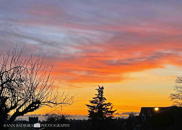 Als ik 's avonds de hondjes nog uitliet was er een soort mistige ring rond de maan, het was volle maan en dat was wel mooi om te zien. Heb er alleen maar een foto van gemaakt met mijn telefoon, evenzeer mooi vond ik. Tijdens onze avond wandelingen zien we dat er hier en daar al wat Kerstverlichting te zien is. De mensen zijn er vroeg bij dit jaar. Volgens de weerberichten gingen we een "bomb cyclone" krijgen in onze omgeving en dat zou van dinsdagavond tot woensdagmiddag zijn. Dit wil zeggen veel regen en veel wind die schade kan aanbrengen en stroomuitval op sommige plaatsen. Ik vind het eigenlijk wel grappig dat telkens er een soort regen/wind storm komt dat men precies weer met een andere naam op de proppen komt. Voorheen was het gewoon een regen storm of wind storm, nu noemt men de regenstormen een "atmospheric river", maar deze bomb cyclone was weer iets nieuws omdat er wind mee gepaard ging. Voorheen was dat gewoon een regen en wind storm...haha. Omdat het in de voormiddag droog was en er nog niet veel wind was, ben ik naar Burnaby Mountain Park geweest om wat foto's te nemen. Daar was ik al een tijd niet meer geweest en toen ik aankwam werd ik verrast door een heel klein beetje sneeuw wat daar in de nacht gevallen was. Er waren ook nog wat overblijvende herfstkleurtjes, besneeuwde bergtoppen en laag hangende wolken. Wat was het daar mooi om even rond te wandelen en te genieten van de prachtige zichten op Indian Arm (18km lange fjord), de bergen en downtown Vancouver. Hier heb ik weer van genoten! Wat de bomb cyclone betreft, hadden wij er persoonlijk weinig last van. De stroom is bij ons nooit uitgevallen, het waaide wel redelijk hard en regende ook en dat was het zowat. Behalve een tuin vol met bladeren hebben we er niets van overgehouden. Blijkbaar waren er zo een goede 200.000 huisgezinnen in onze provincie die zonder stroom zaten. Onze stroom ligt ondergronds en valt bijna nooit uit en zeker al niet bij een windstorm. Velen hebben stroom boven de grond en als dan takken van bomen op die draden vallen, dan ligt de stroom vlug uit.